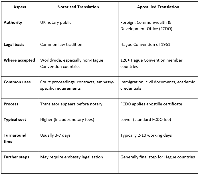 At Document Translation Services, we guide you through this process every day. The wrong format can delay your application by weeks or even lead to rejection. This guide explains the difference between notarised and apostilled translations, helping you choose the right option for your situation.